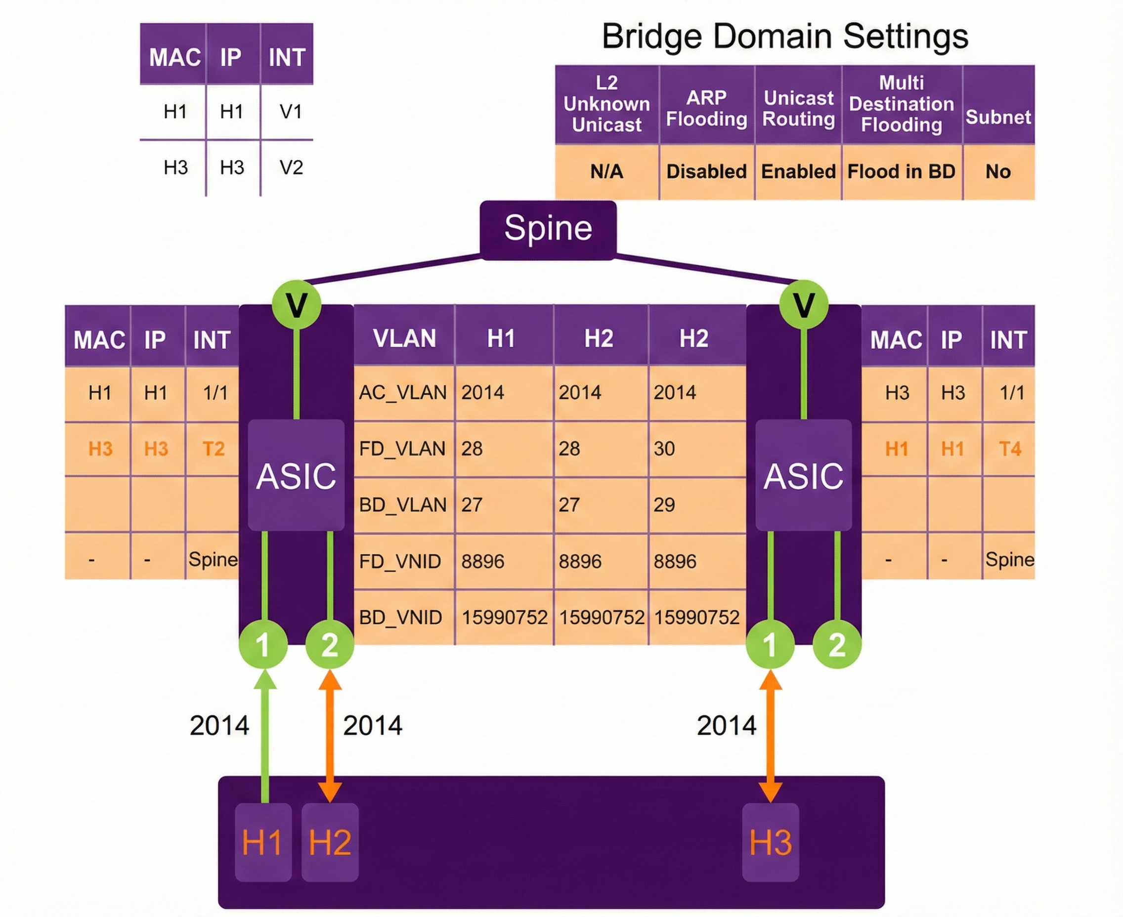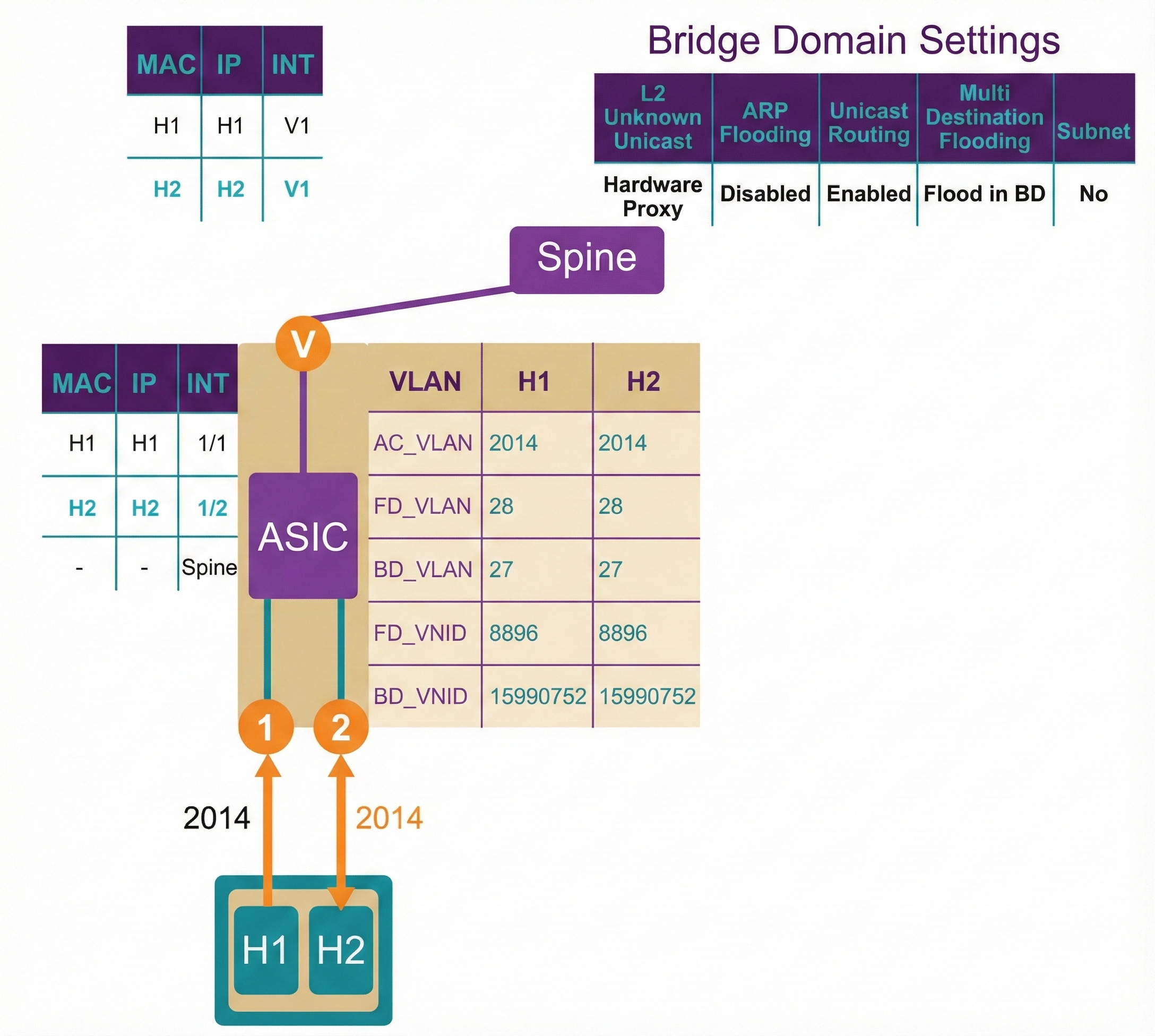 - H2 receives the ARP request and replies, while it is learned in the fabric.