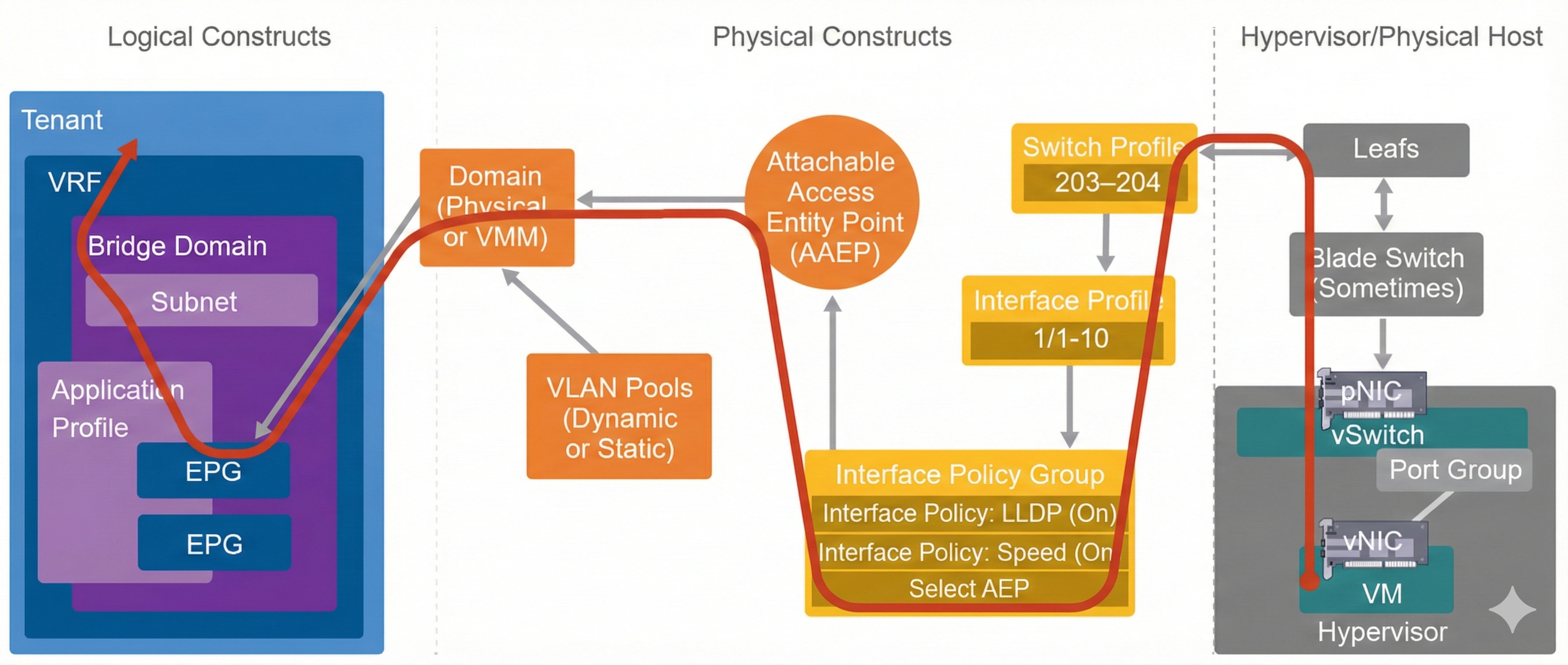 If the physical or hypervisor host connectivity is in order, you can inspect the physical constructs, such as switch and interface profiles, the elements of the interface profiles groups, and the AAEP. The troubleshooting flow should then cover the domain configuration, which can direct the process to the inspection of the logical constructs.