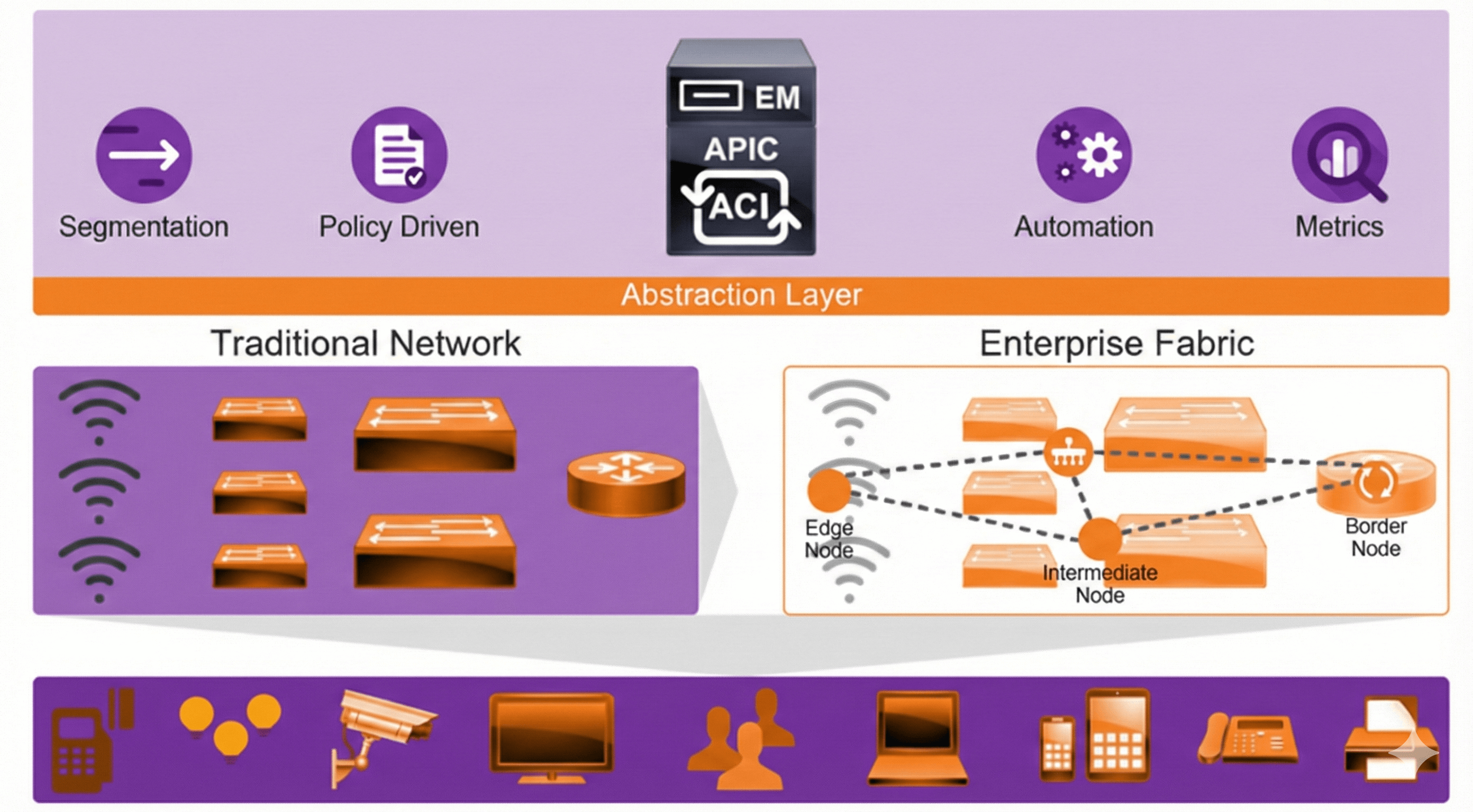 - Hardware Platform Considerations: Switches, routers, wireless controllers, and access points (APs) that support SD-Access.
