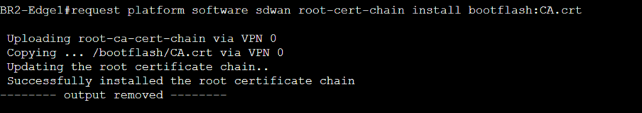 From the BR2-Edge1 CLI, execute the request platform software sdwan root-cert-chain install bootflash:CA.crt command to install the root certificate chain.