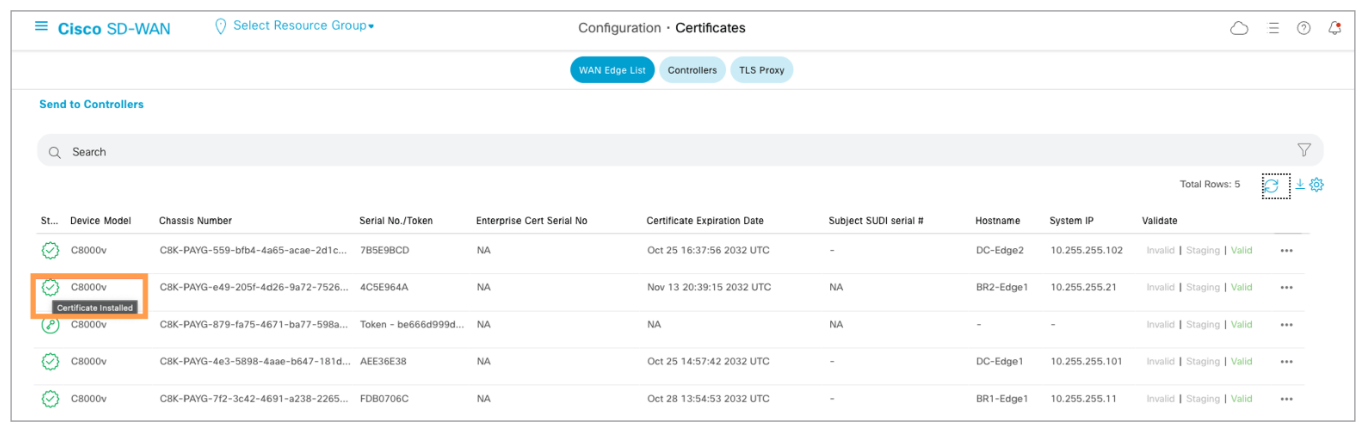 Verify that the certificate is installed on BR2-Edge1 in Cisco vManage. In Cisco vManage, from the main menu, select Configuration > Certificates.