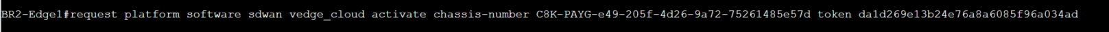Execute the request platform software sdwan vedge_cloud activate chassis-number C8K-PAYG-e49-205f-4d26-9a72-75261485e57d token da1d269e13b24e76a8a6085f96a034ad command to activate the BR2-Edge1 router.