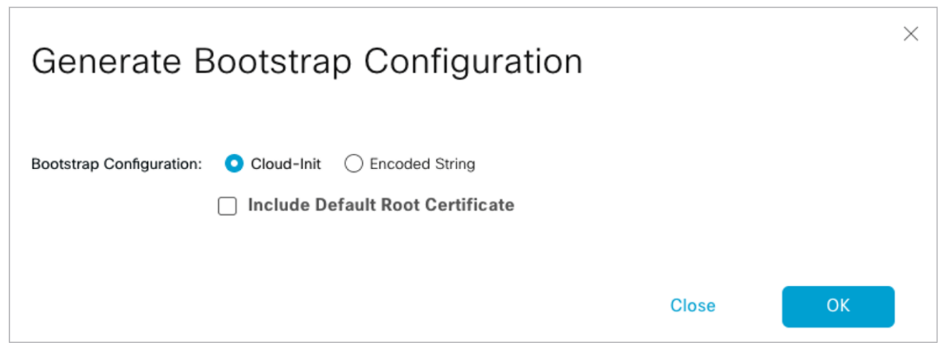 Click the More Actions (...) button and choose Generate Bootstrap Configuration. Choose Cloud-Init, clear the Include Default Root Certificate checkbox and click OK.