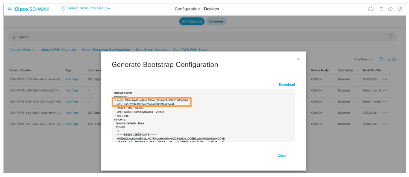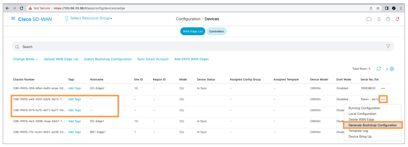 Use one of the unused cloud router entries from the device list to activate BR2-Edge1. Using the More Actions (three dots) button generate the bootstrap configuration for the BR2-Edge1 virtual router. Copy the information to a text file for later use.