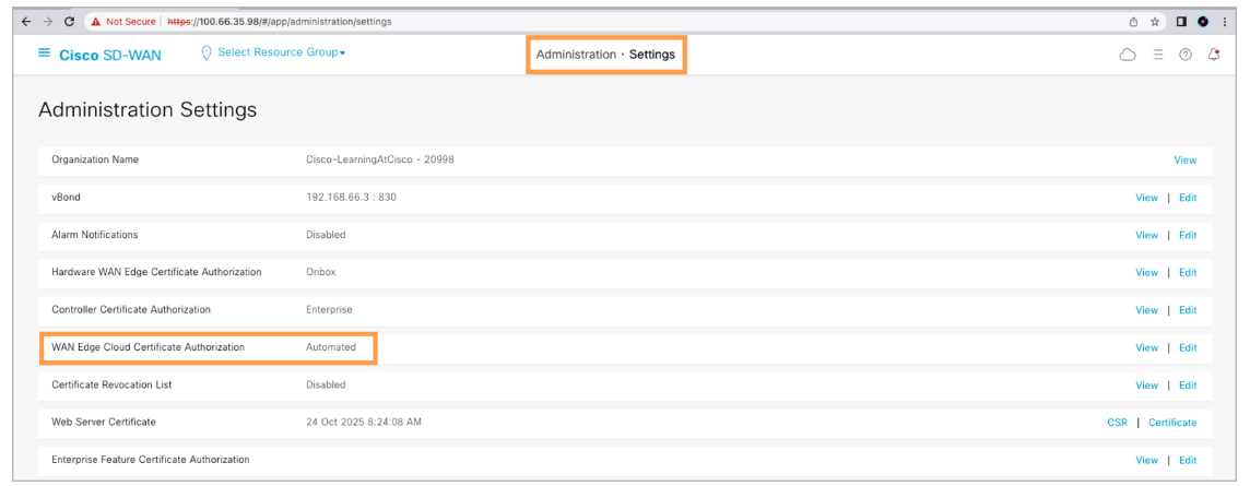 In Cisco vManage navigate to Administration > Settings. Scroll down and find the WAN Edge Cloud Certificate Authorization option and make sure it is set to Automated.