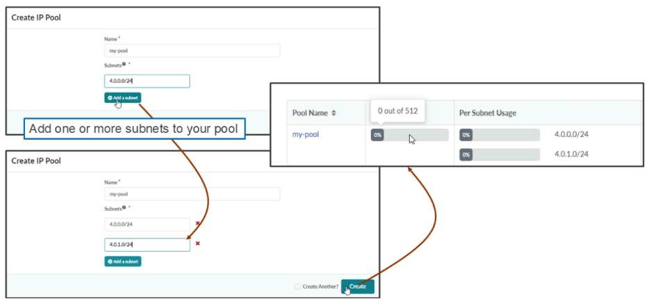 No matter what type of resource you are trying to create, they are all created similarly. The slide shows an example of how to create an IPv4 pool of addresses. Navigate to Resources > IP Pools and click Create IP Pool .