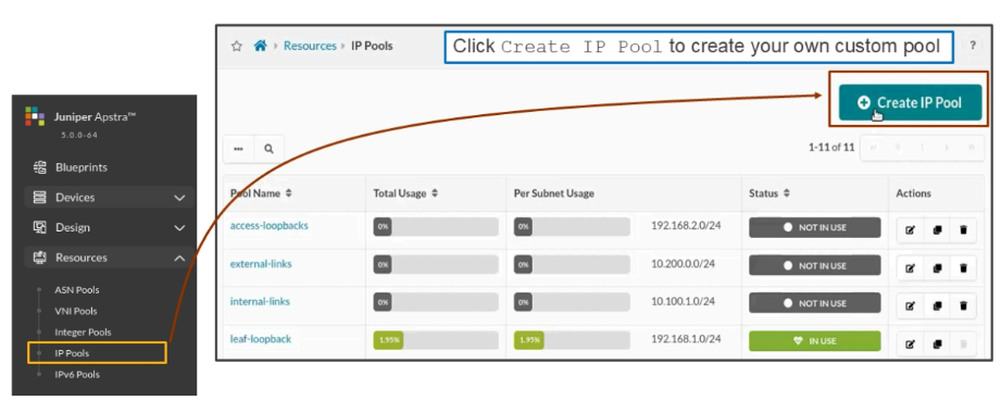 In the Create IP Pool window, you can give your IP pool a name and subnet(s). Click Create when you finish. Notice that the new pool is now available to be used by a blueprint. By hovering your cursor over the pool, you can get an idea of how many IP addresses Juniper Apstra has used from the pool.