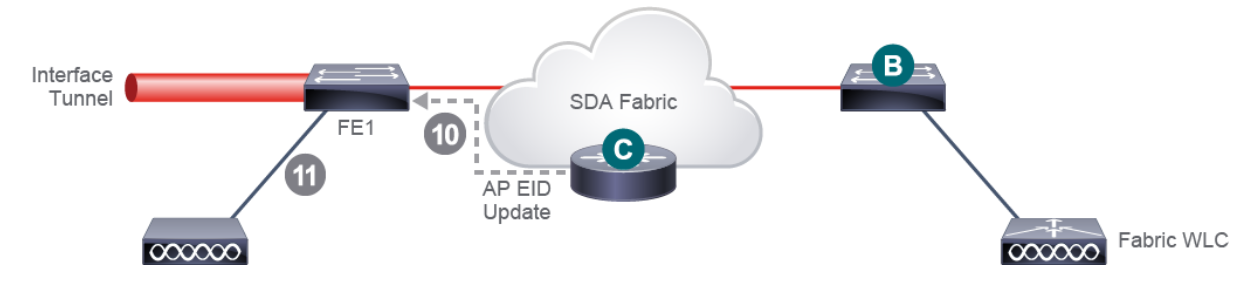 10. As a result of this proxy registration, the control plane updates the fabric edge with the metadata that is received from the WLC (sending a flag, which says that the endpoint is an AP, and the AP’s IP address).