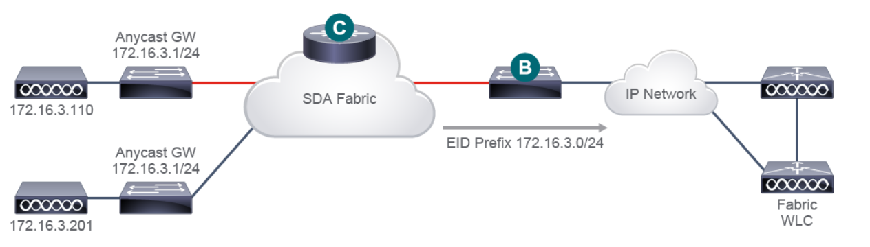 - A client subnet maps to the VLAN with anycast gateway on all fabric edge switches.