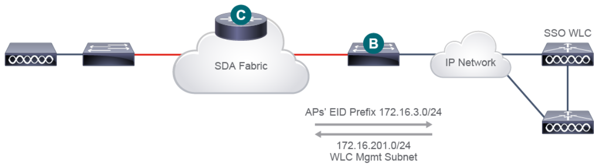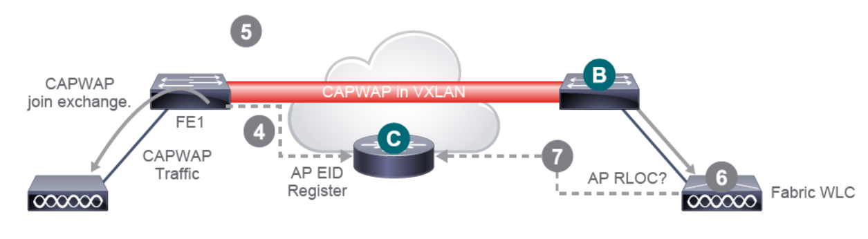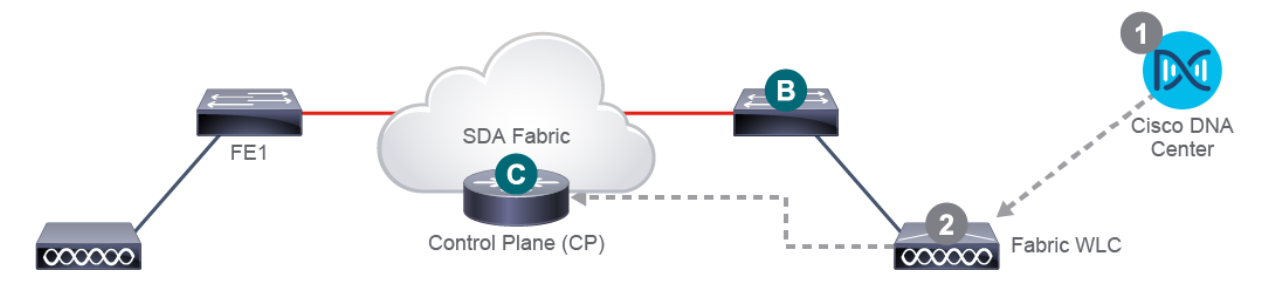 - WLCs integrate with the fabric control plane nodes via LISP.