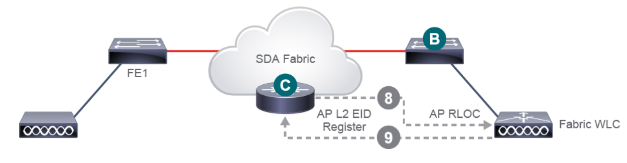 9. The WLC performs Layer 2 LISP registration for the AP in the control plane, also known as AP “special” secure client registration. This way the WLC can pass important metadata information to the fabric edge