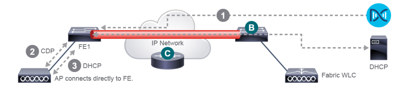 - The fabric edge discovers the AP via CDP when it is plugged in. The fabric edge applies the macro to put the switch port into proper VLAN.