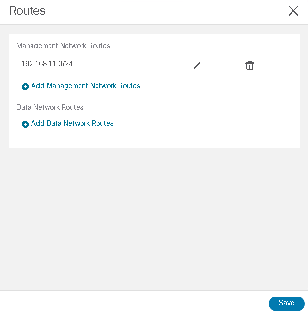 Go to Infrastructure >Cluster Configuration. In the Routes area, click Edit (the pencil symbol), choose Add Management Network Routes, enter 192.168.11.0/24, confirm it, and click Save.
