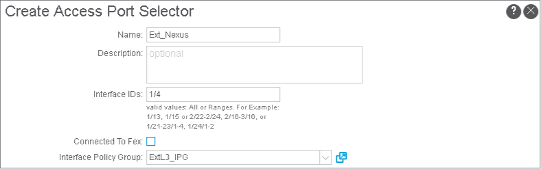 In Fabric > Access Policies > Interfaces > Leaf Interfaces > Profiles, choose LEAF101_IFP, and click + and Continue to configure an interface selector. Add the interface selector Ext_Nexus with the interface ID 1/4 and associate it with the interface policy group ExtL3_IPG. Click Submit.