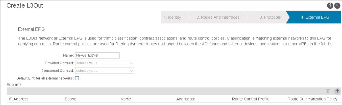 Navigate to the External EPG page. In the page, enter the external EPG name Nexus_ExtNet, clear the Default EPG for all external networks check box, and click + in the Subnets table.