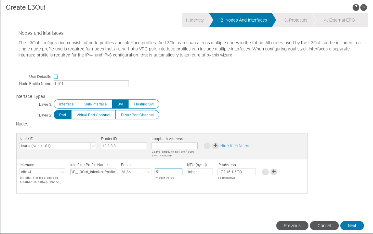 Layer 3 Interface Type: SVI.Recall the interface types for external Layer 3 connections: routed interfaces, routed subinterfaces, SVIs, and floating SVIs. You will implement the SVIs, which allow multiple connections over a single physical link.
