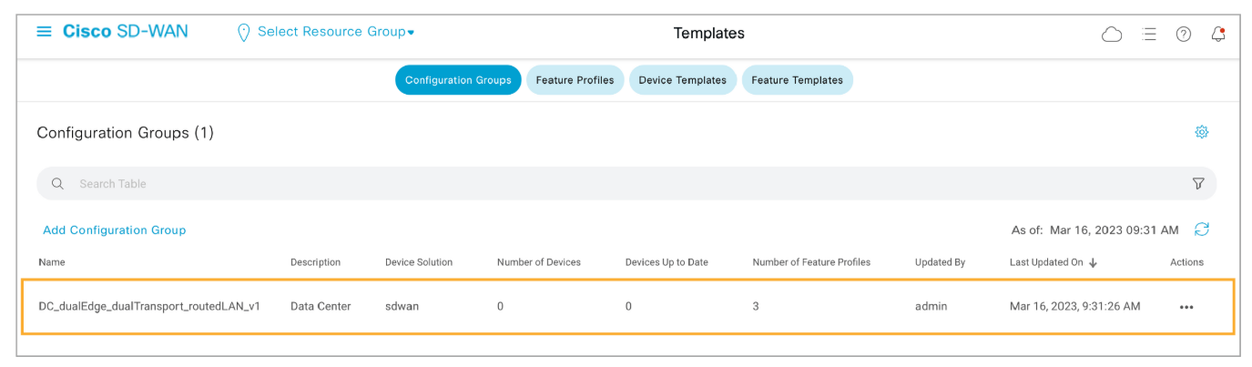 Verify that the DC_dualEdge_dualTransport_routedLAN_v1 configuration group is created.