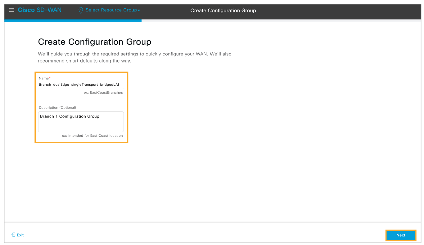 Step 9: Start the Create Configuration Group workflow once more to create a configuration group for the Branch 1 site.