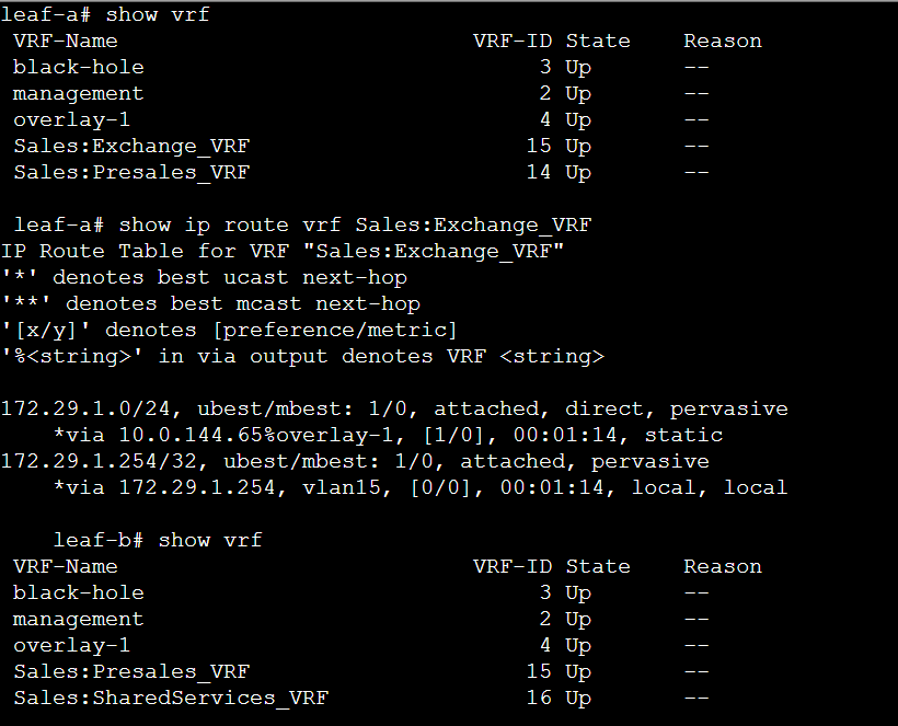 Use PuTTY to connect to leaf-a & b. Log in . View the VRFs and examine the Exchange_VRF routing table.
