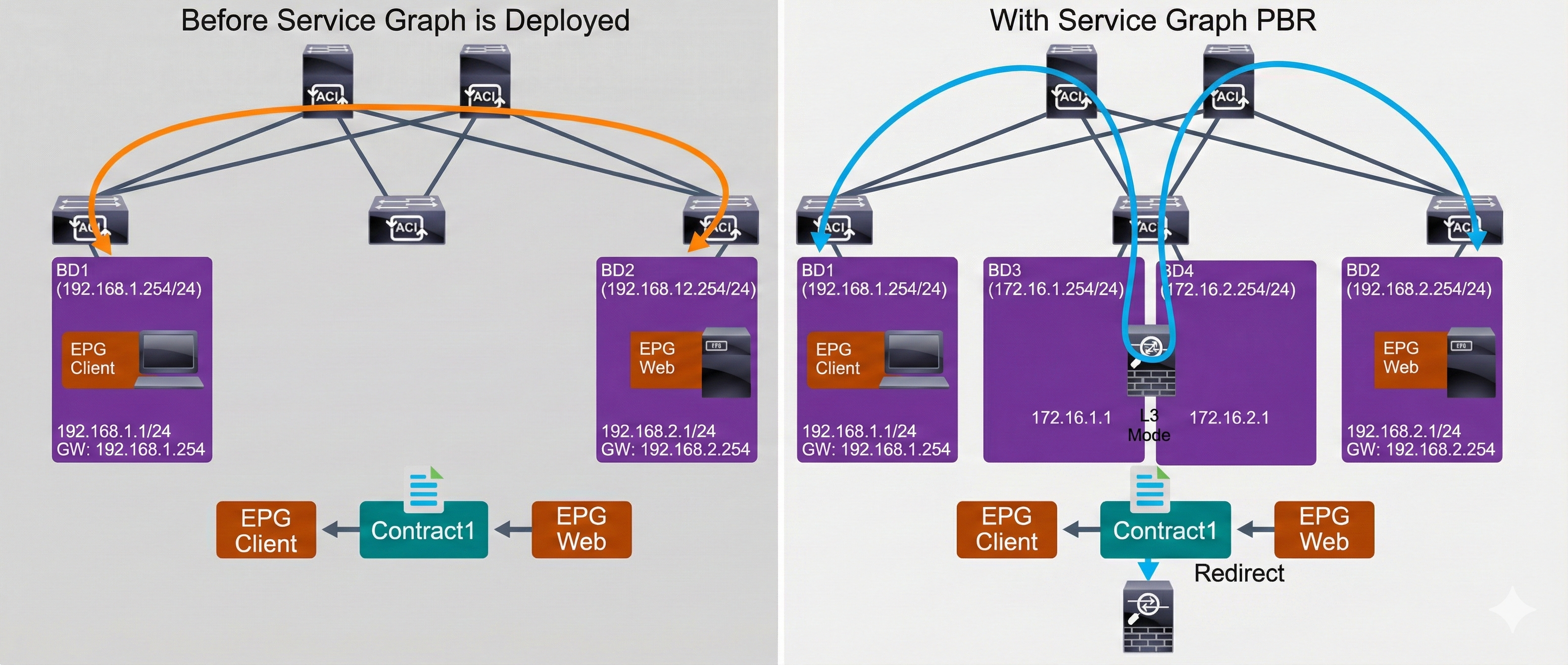 When the service graph with PBR is used, even though the forwarding table points to the destination endpoint directly, the traffic is redirected to the service node (such as firewall) based on the contract the traffic is hitting. In the contract with the PBR service graph, the traffic redirection is defined towards the service node, which operates in Layer 3 mode and is integrated as service node in the Cisco ACI fabric. It routes and inspects the traffic between the client and server, which is deployed in different EPGs.
