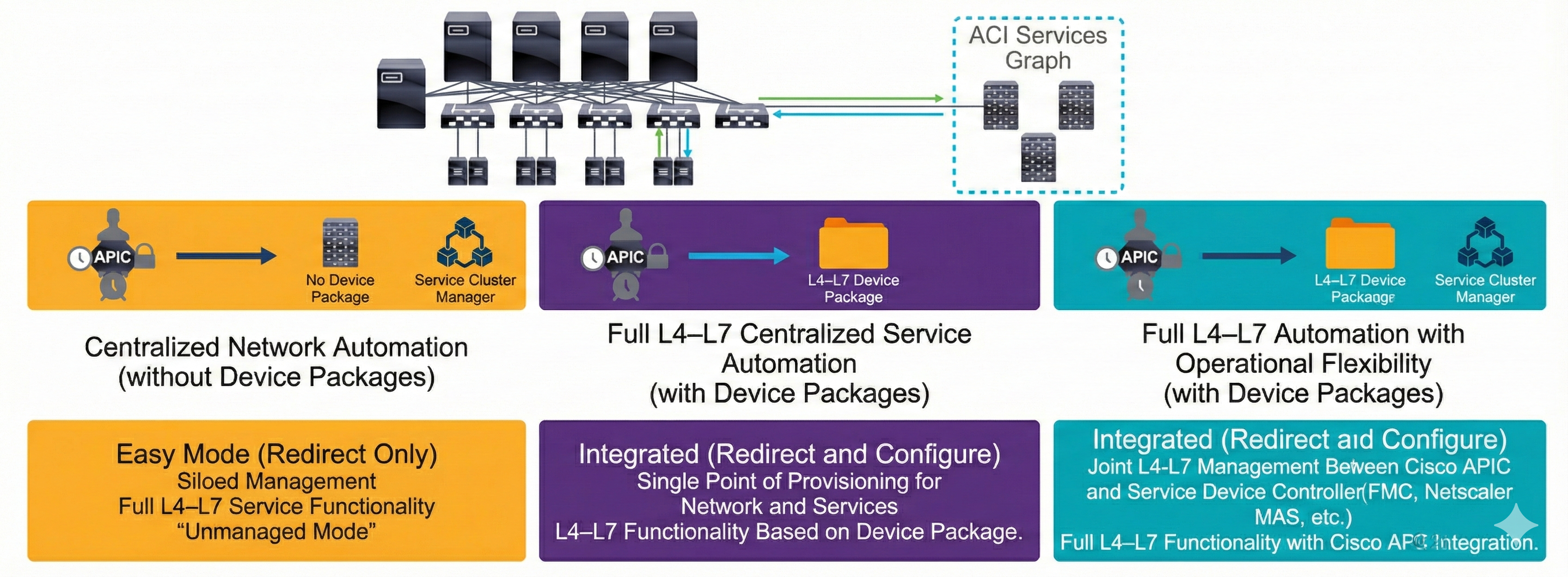 On the other hand, with the Cisco ACI Layer 4–7 service automation possibilities, the unmanaged and managed modes provide support for different devices and flexibility options, as depicted in this figure.