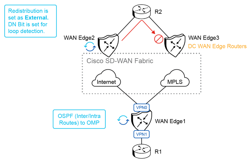 RFC 4577 has been implemented to solve the routing loop issue with OSPF. RFC 4577 implements a concept called the down bit (DN). OMP routes are redistributed into OSPF as External routes with the Down (DN) bit set.