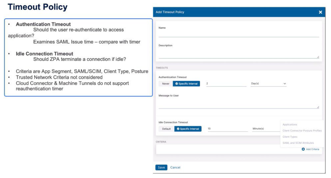 The Timeout policy triggers when the user should reauthenticate. This is based upon business reasons. For certain applications we might want a more frequent authentication interval. The Idle Timeout makes the decision “if we haven't seen any packets for an amount of time for a transaction should we consider it idle and terminate the connection?” The criteria for a Timeout policy are the application names, or the application segments, or segment groups, the Zscaler Client Connector posture profiles, the client types, and then SCIM and SAML attributes.