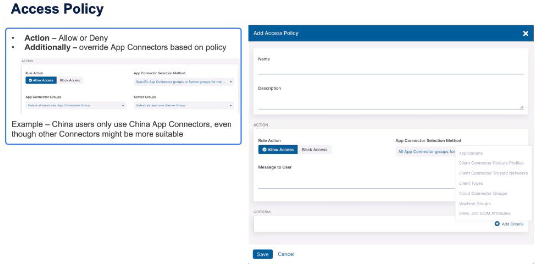 An example of this, we might identify users as being in China and specifically want to use the China App Connectors where everywhere else in the world we'd use the most suitable connector that's available. With access policy, we can make criteria based on applications, the Zscaler Client Connector posture profiles, the trusted networks, the client types, the Zscaler Cloud Connector groups (if we're using Zscaler Cloud Connector) or machine groups, so the forwarding mechanisms, and then the SAML and SCIM attributes.