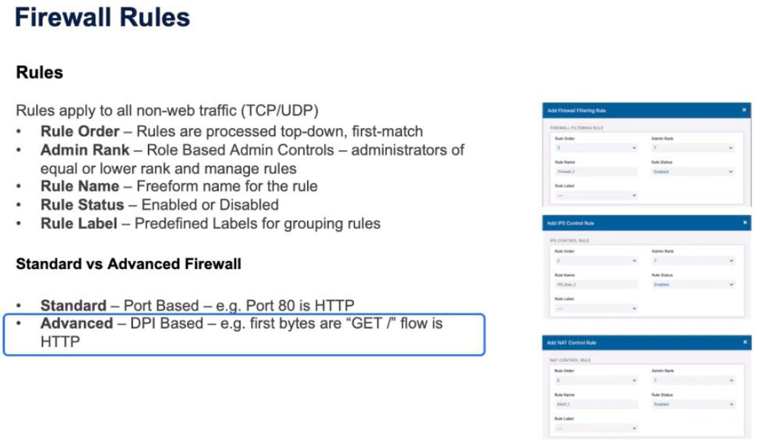 The rule is applied for the Standard or the Advanced Firewall. The decisions are based on Standard, which is the port-based rules. Port 80 is HTTP and the predefined rules come from the Resources tab or the Advanced Policy based on DPIs (deep packet inspections). Looking at the first Magic Bytes of the traffic, seeing a GET means that it’s HTTP, and we can identify that and pass it to the HTTP proxy.