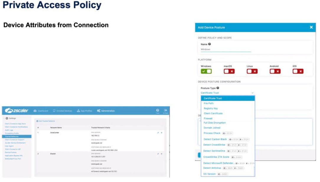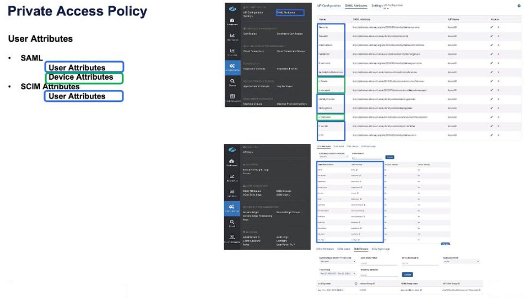 The Zscaler Private Access policy is predicated first off on SAML attributes and SCIM attributes. A SAML attribute might have user attributes as well as device attributes, and a SCIM attribute is entirely device-based, but is pushed through the SCIM sync.