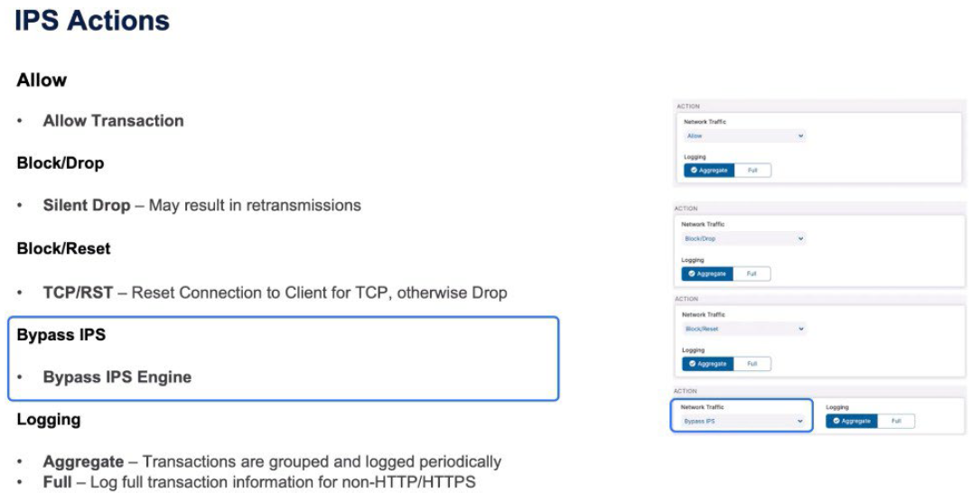 IPS actions are similar to Firewall actions. You may either allow the transaction if it's been identified as matching the rule. You may do a BLOCK, which is a silent Drop, which may result in retransmissions. A BLOCK/RESET, where you get a TCP reset towards the client, otherwise a single Drop for UDP. You may make a decision to bypass the IPS engine entirely if you are seeing, for example, false positives. And then the logging is similar to a firewall. You either do Full Logging of transactions for non-HTTP and HTTPS, or you do Aggregate Logging, which is periodically logging transactions as they’re grouped together.