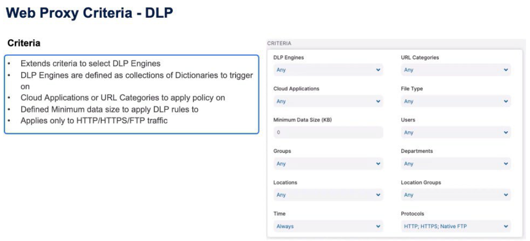 For Data Loss Prevention (DLP) rules, the criteria extend to include the DLP Engines as well as the Cloud Application information, the file type information, and a minimum size for that object to trigger on. Again the Users class, Group, Department, Locations, Location Groups, Time, and Protocols, all apply but the protocol can only be HTTP or HTTPS, or native FTP for this rule to trigger.