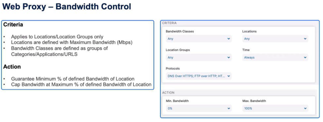 - Bandwidth Classes: Used for bandwidth management by mapping URL categories to bandwidth classes and applying them through Bandwidth Management policies.