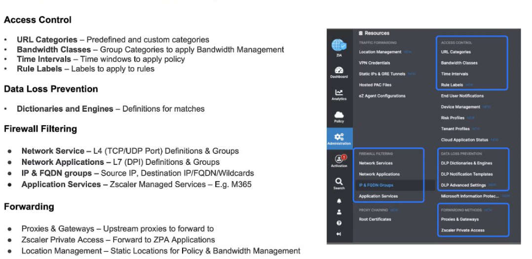 These resources enable granular control over traffic behavior, performance, and security within Zscaler Internet Access.
