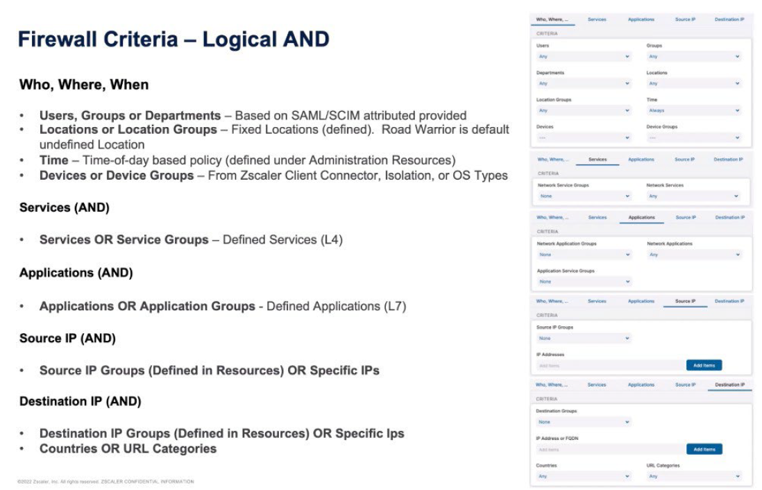 The rules and criteria for Firewall are then logically ANDed together across each of the different sections. We make a decision based on the first set of criteria that are user and device based. Users, Groups, Departments, Locations, Location Groups, the Time, the Devices, and the Device Groups. We ALL all of those together so it’s a User, all the Groups, all the Departments. Then logically AND those transactions with the services of the Service Group. The services are the Layer 4 services – the Standard Firewall port 80, port 443, port 3389 for remote desktop.