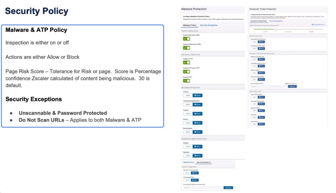 Security policy is absolute. For every transaction we want to apply the Security policy. We’re going to inspect all inbound and outbound traffic, to inspect HTTP, FTP over HTTP, native FTP, and apply all of the Malware Protection rules. But you might want to make decisions to not scan certain URLs or URIs. Now, when you make a decision not to scan traffic, it excludes it from both the Malware Protection and the Advanced Threat Protection.