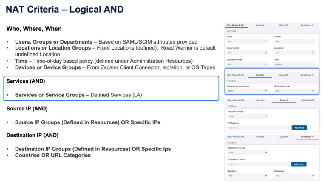 With NAT Control similar to Firewall Control, a logical AND between the who, the where, the services, the source IP, and the destination IP. So again, Users, Departments, Groups from the SAML/SCIM attributes, the Locations from the previously defined locations, the Time of