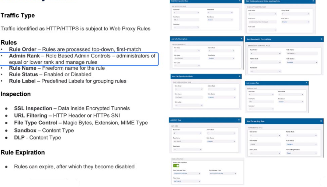 Zscaler’s web proxy configuration provides a structured approach to rule creation and enforcement. It supports ordered rule evaluation, consistent naming conventions, SSL inspection policies, and clearly defined criteria for rule application. These criteria include URL categories, user groups, request methods, DLP conditions, and corresponding actions.