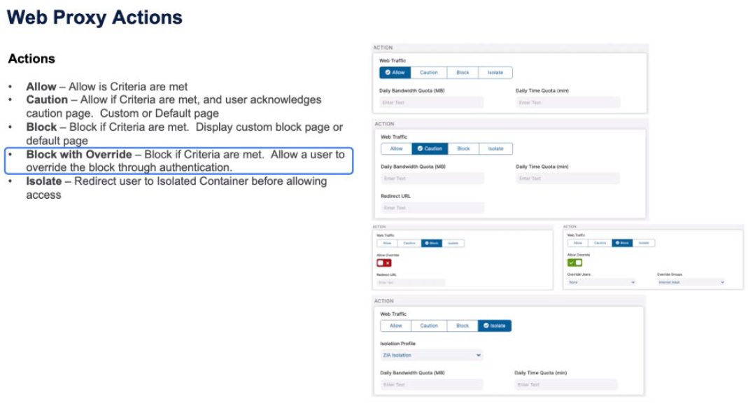 A good example of this is when Zscaler is deployed in schools. You want a default Block page, but you want the teacher to be able to authorize the override of a rule because of certain class conditions or their own judgment. Then, the final one is Isolate. For whatever reason we want to move the user from accessing the website directly to putting them in an isolated container before allowing access.