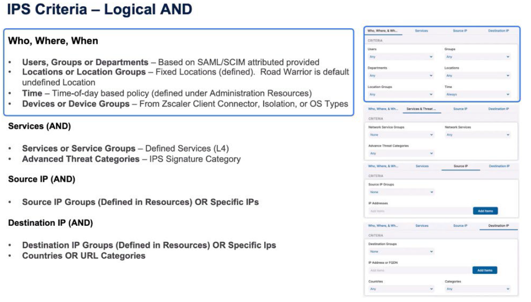 We look at the IPS criteria for the intrusion prevention system. We’re going to again apply policy based on User, Group, Department from the SAML/SCIM attributes, the Location or Location Groups from those definitions within the resources, the Time of day-based policy from the Resources section, and the Device or Device Groups from Zscaler Client Connector isolation or those Operating System types. There’s then a logical AND with the services so the Layer 4 services and the Advanced Threat Categories which are the IPS Signature categories.