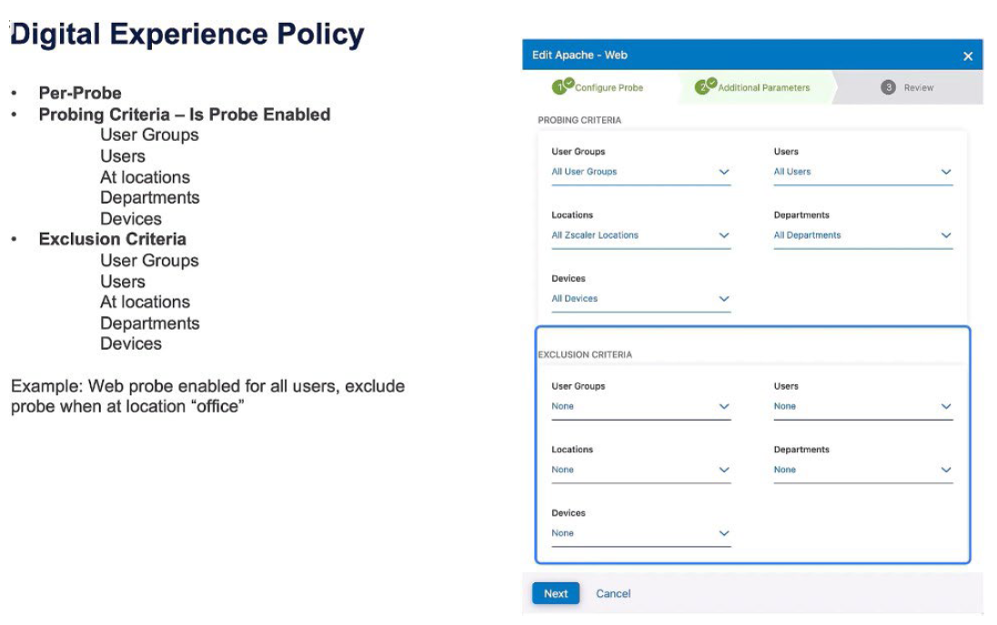Let's take a look at the policy constructs for Zscaler Digital Experience. The policy constructs are essentially, “should the probe exist for these criteria”? On a per-probe basis, is the probe enabled based on: user groups, specific users, locations, departments, or devices? Or, an exclusion criteria says “this probe will not run on specific user groups, users, locations, departments, or devices”. An example of this: exclude a probe when the user is in the office.