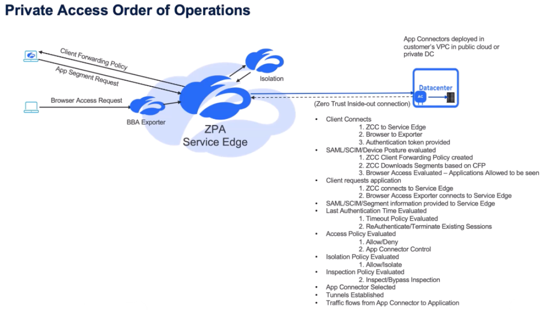 The SAML/SCIM/Device posture is evaluated as part of that connection. The Service Edge makes a Client Forwarding policy for Zscaler Client Connector. And that's the definition - based on the policy - of what app segments the user is allowed to download or the Zscaler Client Connector can download. With browser-based access, the user is logging into the Exporter function and as part of that authentication, the Service Edge identifies which applications the user is allowed to see and therefore which ones they're allowed to connect to.