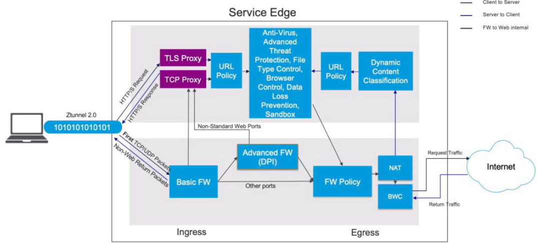 A well-defined operational flow ensures that traffic is processed efficiently and securely as it traverses the Service Edge. When a client establishes a tunnel to the Service Edge, the tunnel is terminated and traffic is classified—such as HTTP or HTTPS—before being forwarded to the proxy engine for further inspection and policy enforcement.