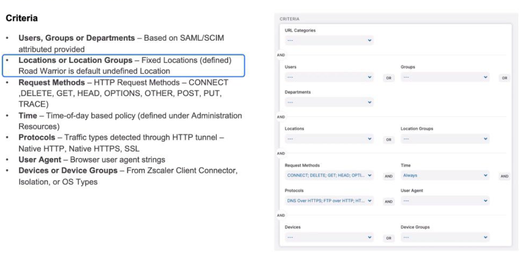 The request methods, whether it’s an HTTP CONNECT, a POST, a DELETE. What time does this apply? What protocols does it apply for and what user agents does it apply for? These might be ANDed together. And then the device types, whether they’re Zscaler Client Connectors? Are they coming from Isolation or can we see it from the operating system types? Within all of those criteria, we define them. Certain criteria like user or group or department, they’re ANDed together across each of those segments to make a criteria that will trigger for that rule as it’s processed.