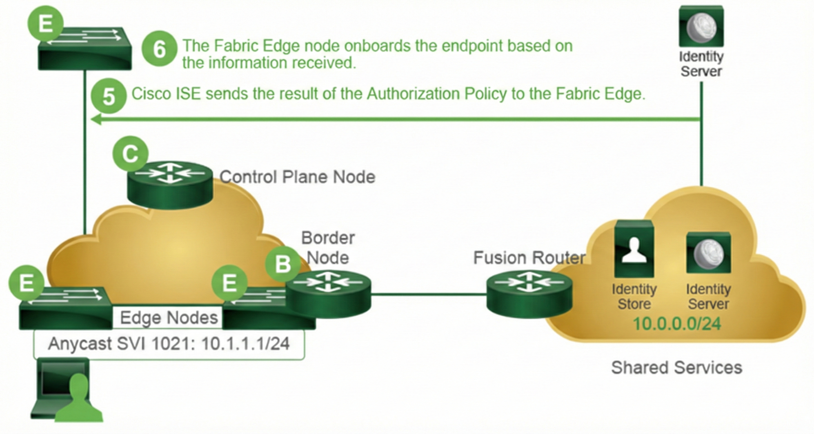 5. If the endpoint or the user is successfully authenticated, Cisco ISE inspects the Authorization policy and sends the results of the matched entry to the fabric edge node.