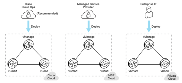 The SD-WAN architecture provides maximum flexibility for deploying the controllers: Cisco vManage, vSmart, and vBond.