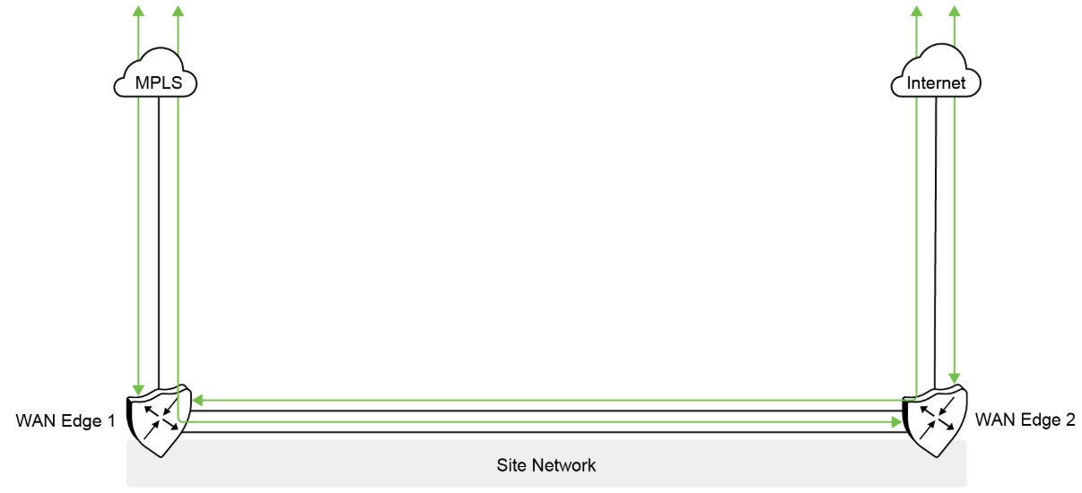 In the figure, WAN Edge 1 connects directly to the MPLS transport and uses the TLOC extension interface on WAN Edge 2 to connect to the internet transport. In turn, WAN Edge 2 connects directly to the internet transport and uses the TLOC extension interface on WAN Edge 1 to connect to the MPLS transport. The connection from a TLOC extension interface through to transport is transparent. WAN Edge 1 router in the diagram still has two physical interfaces with tunnels configured – one to the MPLS and one to the internet and is unaware that the tunnel to the internet passes through another Cisco SD-WAN router.