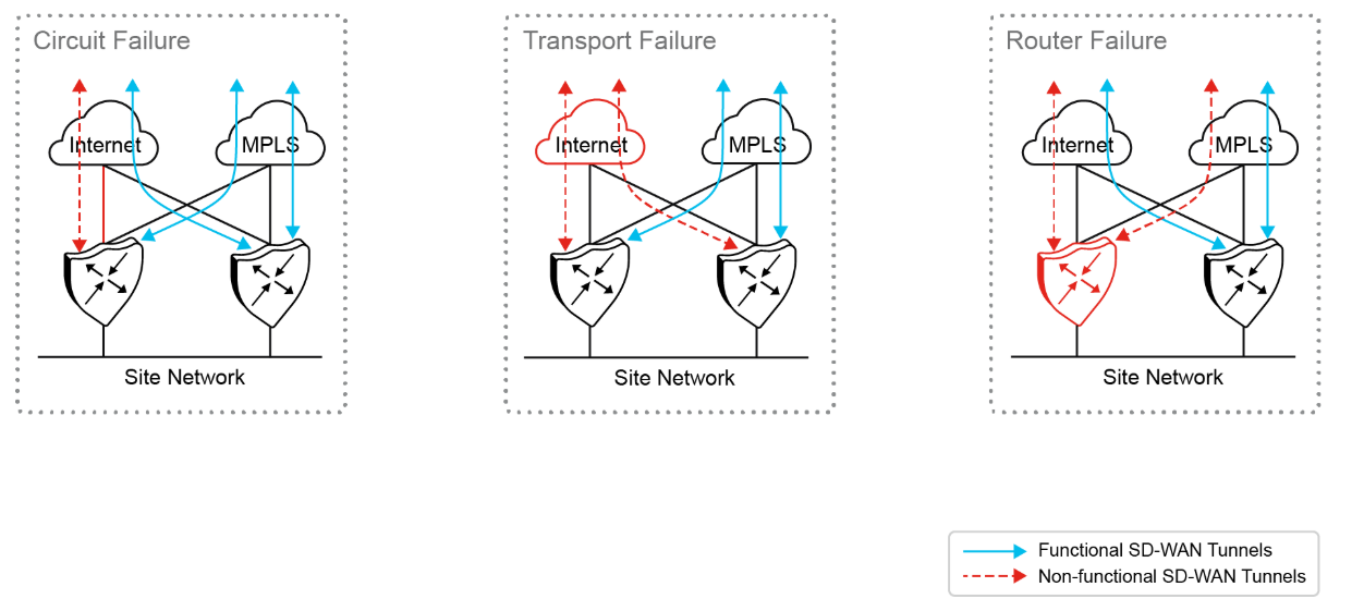 During a circuit failure, both edge routers maintain WAN connectivity to at least one transport provider. During a transport failure, both edge routers maintain WAN connectivity to the remaining transport provider. In case of a router failure, the remaining edge router maintains connectivity to both transport providers.