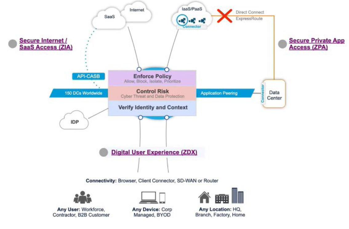 - Zero Trust SD‑WAN enablement: Eliminating legacy routable networks and enabling users to access the internet securely from anywhere using Zscaler Client Connector.