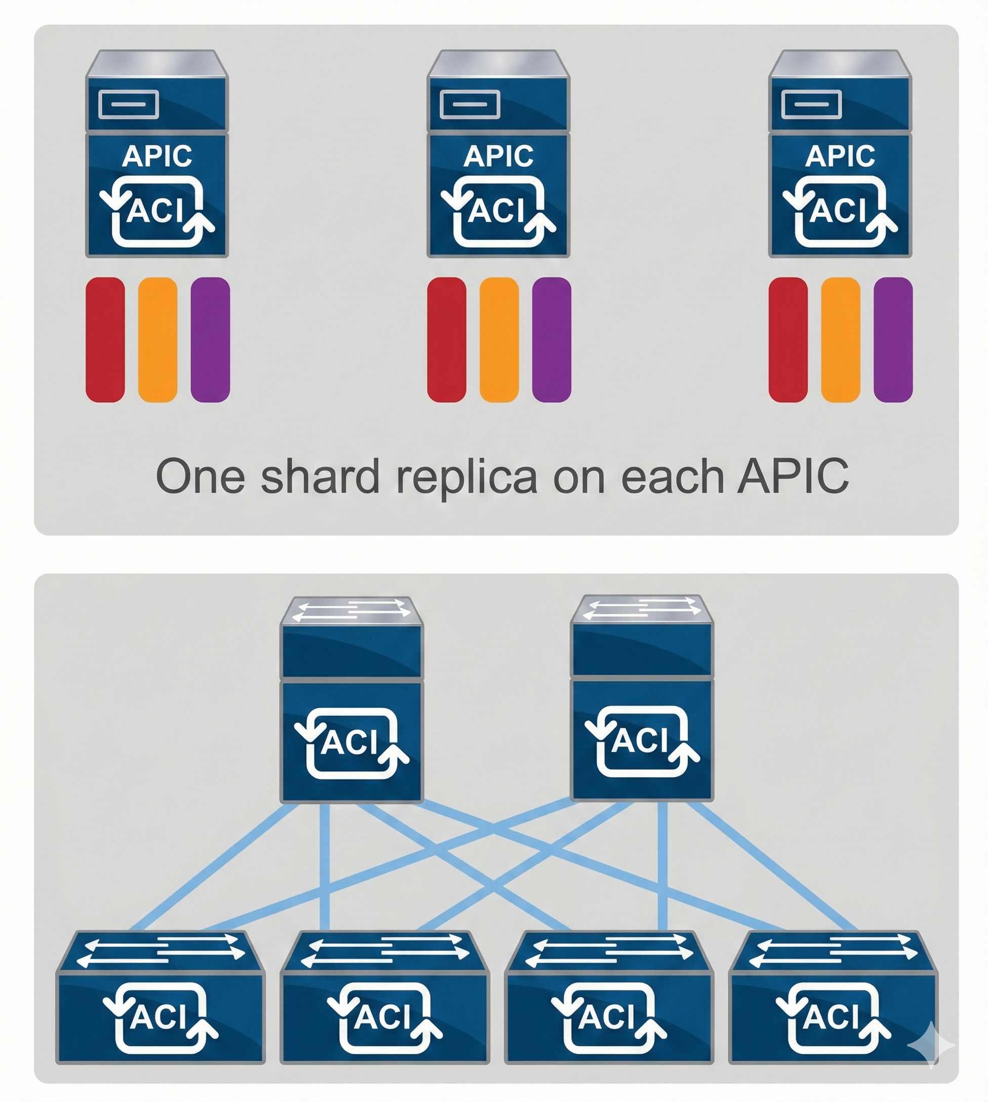 The APIC cluster uses a large database technology called sharding. The APIC configuration database is partitioned into logically bounded subsets, called shards, and each shard has three replicas. The shards are evenly distributed across the APICs, while the shard data assignments are based on a predetermined hash function, and a static shard layout determines the assignment of shards to appliances. This specific database technology provides scalability and reliability to the data sets that are generated and processed by the Cisco APIC.